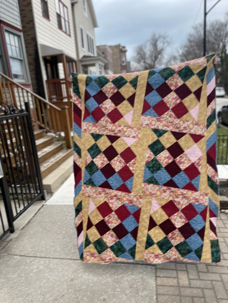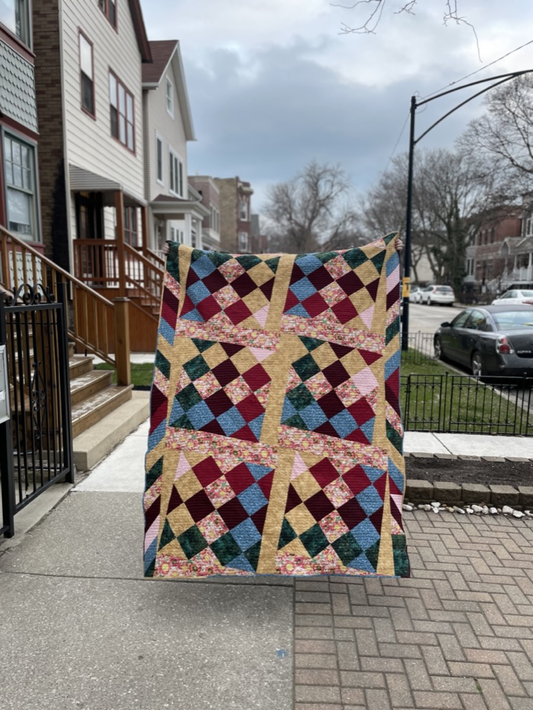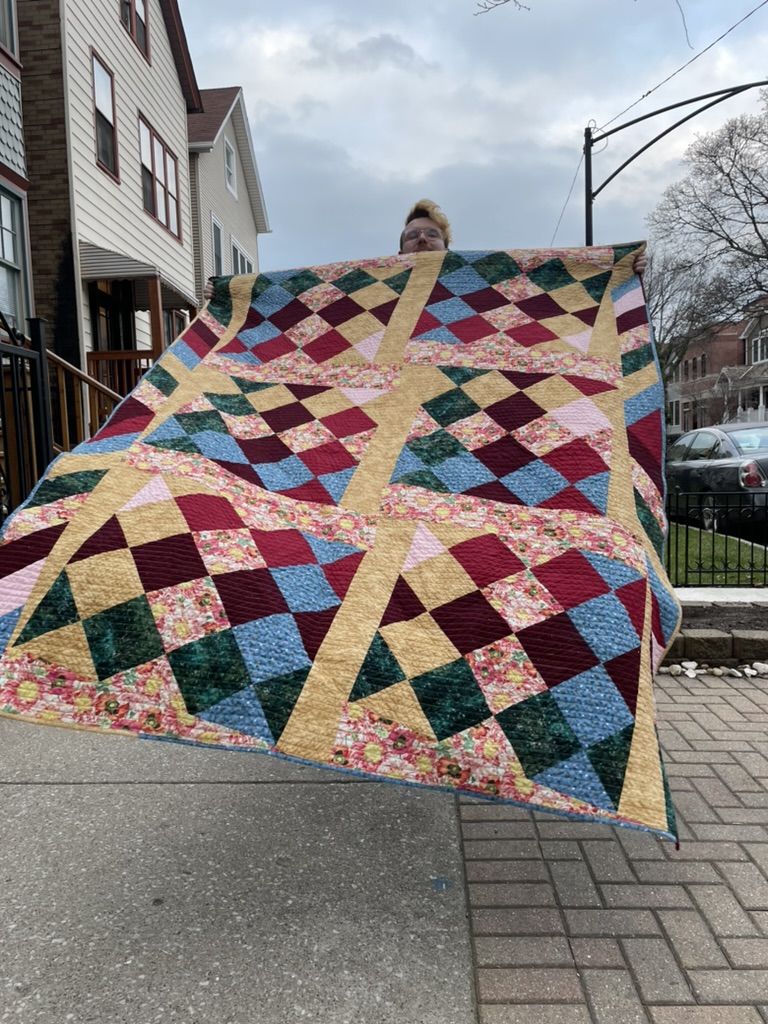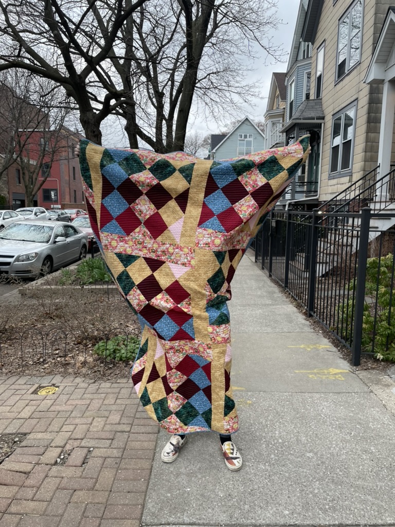This pattern was inspired by abstract painter Max Bill’s “Six Penetrating Colors” (1966-67), which I found in a book I picked up from the Brown Elephant. Resisting the improvisational impulse other abstractionists like Kandinsky called for, Bill sought a mathematical approach to art based in rhythms, formulae, and variations. Beyond the inspiration for the diamond block, I improvised the remainder of the quilt. The cotton-print fabric selections and diamond pattern evoke traditional quilting aesthetics, offset by a tilt that is distinctly contemporary. A bricolage of both old and new, this quilt queers the history of quilting with a postmodern design that fits just as comfortably in a cottage or a loft.